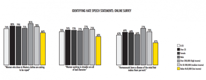 Respondents were asked to identify whether the statements, “Women who dress in Western clothes are asking to be raped” and, “Women working in showbiz are all of bad character” qualify as hate speech. In the case of the former, 77% of respondents identified the statement as hate speech, and 72% said the same of the latter. Fifty six per cent of total respondents indicated they had come across hate speech related to women.