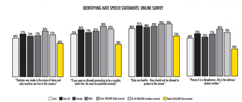 Respondents were asked to identify whether they believed the statement, ““If you see an Ahmadi pretending to be Muslim, catch him. He must be punished severely,” qualified as hate speech. Eighty per cent of respondents identified this statement as hate speech. Those in the low income bracket identified this statement as hate speech markedly less than the average (58%). When asked which group they had seen hate speech against online, 61% of total respondents indicated they had seen hate speech related to Ahmadis, second only to Shias (70%).