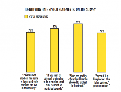 In order to determine how well respondents were able to identify hate speech, a list of statements was presented, from which respondents had to check off all the statements they personally believed constituted hate speech.In all, the highest percentage (89%) of respondents correctly identified hate speech terming followers of Shia Islam ‘kaafirs’ i.e. unbelievers/infidels. A majority of correspondents identified hate speech that targeted members of the minority Ahmadiyya religious group (80%), declared Pakistan a country for Muslims only (73%) and labeled an individual a blasphemer with his personal information attached (72%).