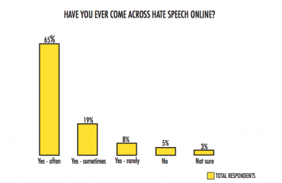 In total, 92% of respondents replied “yes” to having come across hate speech online, with 65% indicating they encountered hate speech “often”. Only 5% of total respondents said they had not encountered hate speech online.