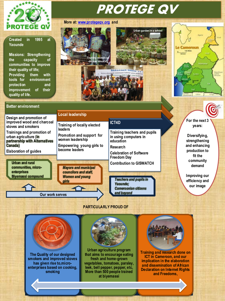 PROTEGE QV, which stands for "Promotion of Technologies that Guarantee Environment and Quality of Life" in French, is a Cameroonian non-governmental organisation created in 1995. It aims to promote individual and collective initiatives to promote rural development, protect the environment and improve the well-being of communities. PROTEGE QV believes in the power of ICT to provide equal access to information as a strategy to fight against poverty.